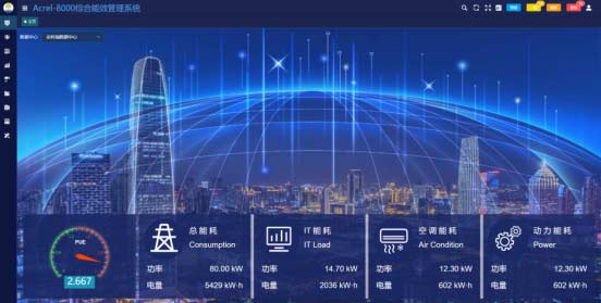 主頁(yè)展示當(dāng)前數(shù)據(jù)中心PUE值,總能耗,IT能耗,空調(diào)能耗,及其他能耗。
