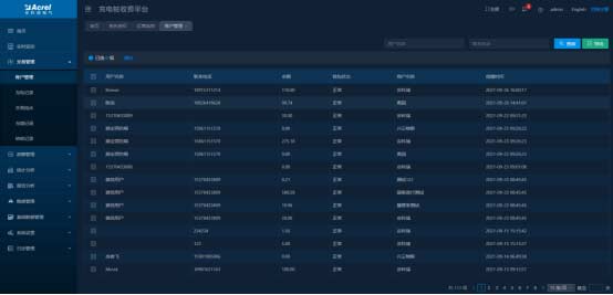 顯示所有關聯充電用戶的賬戶信息,可進行充值、退款、凍結、解凍、注銷等操作。