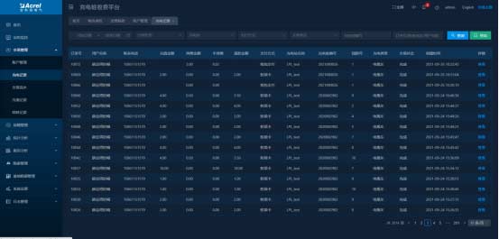 顯示所有訂單數據,可以對訂單按照充電站、充電樁、支付方式、交易狀態等進行分類查詢,可對充電中的充電樁進行停止充電操作。