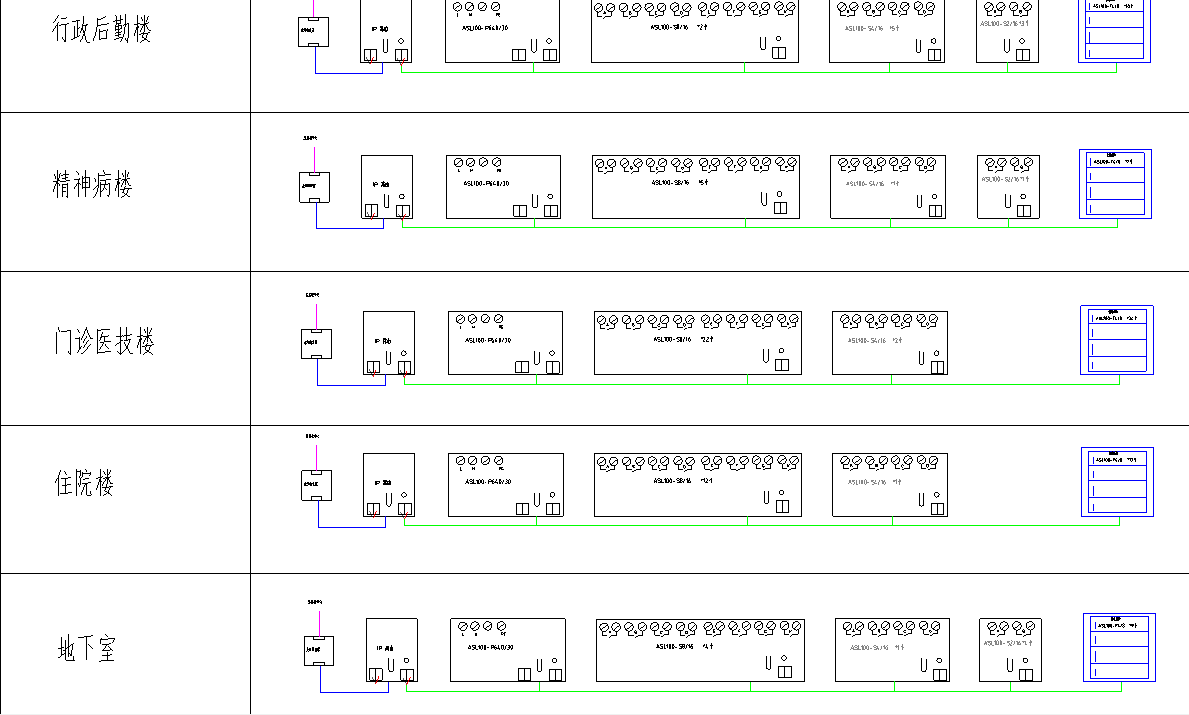 門診樓、住院樓、精神病樓、感染樓、行政樓樓、室外夜景照明等采用6條支線(KNX總線線纜BUS EIB2*2*0.8)到消防控制值班室,通過IP網關接入到醫(yī)院內網交換機,實時數據上傳到Acrel-iLightControl(智能照明控制系統(tǒng))。
