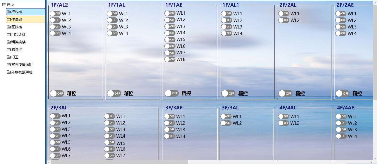 ?在醫(yī)院各建筑物每層護士值班站、前臺值班站或通道內安裝智能面板,前臺值班人員可根據當前需求對該受控區(qū)實現集中控制,對該區(qū)的單回路開關控制、分區(qū)域控制等;遠程與就地控制相互關聯,照明回路可隨時按需調整。