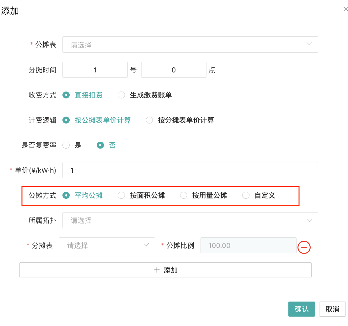 分攤方式支持固定單價、比例分攤、面積分攤、 用電量分攤;