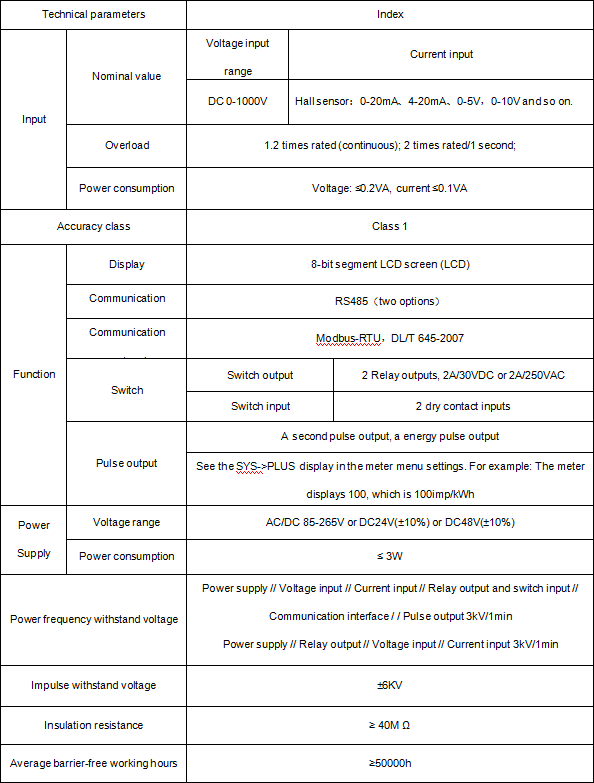 The meter can have infrared communication interface and RS-485 communication interface, and supports Modbus-RTU protocol and DLT645-97 (07) protocol at the same time.The meter can have relay alarm output and digital input function;You can set the ratio, alarm, and communication through the meter panel keys according to different requirements.The meter can have event recording of switch (Modbus protocol), programming and event setting records (645 protocol), instantaneous and timing freeze function of data (645 protocol), maximum and minimum value recording function of voltage and current power.