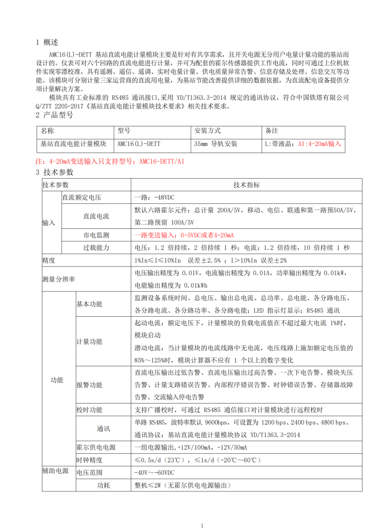 AMC16(L)-DETT基站直流電能計(jì)量模塊