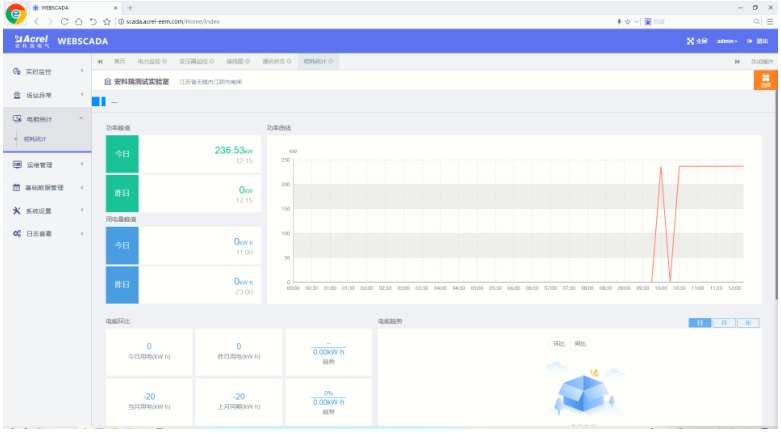 能耗統(tǒng)計頁面顯示各回路的功率峰值和用電量峰值,功率、電能趨勢曲線,電能環(huán)比, 用電排名。